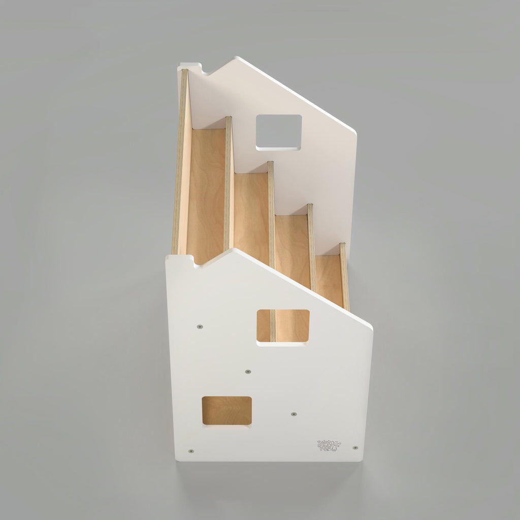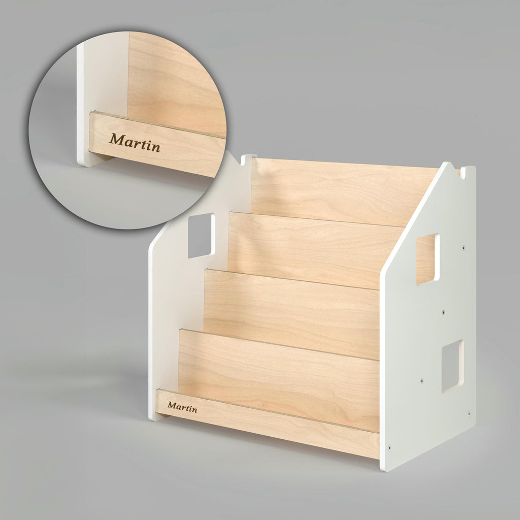 Grazie al suo design minimalista, lo scaffale per libri si adatta a tutti gli interni. È composto da 4 ripiani e può contenere molti libri; sul retro c'è anche uno spazio per riporre i giocattoli o i libri. Lo scaffale Montessori è stato progettato con grande attenzione alla sicurezza: è stabile, rivestito con vernice a base d'acqua e tutti gli angoli sono arrotondati.