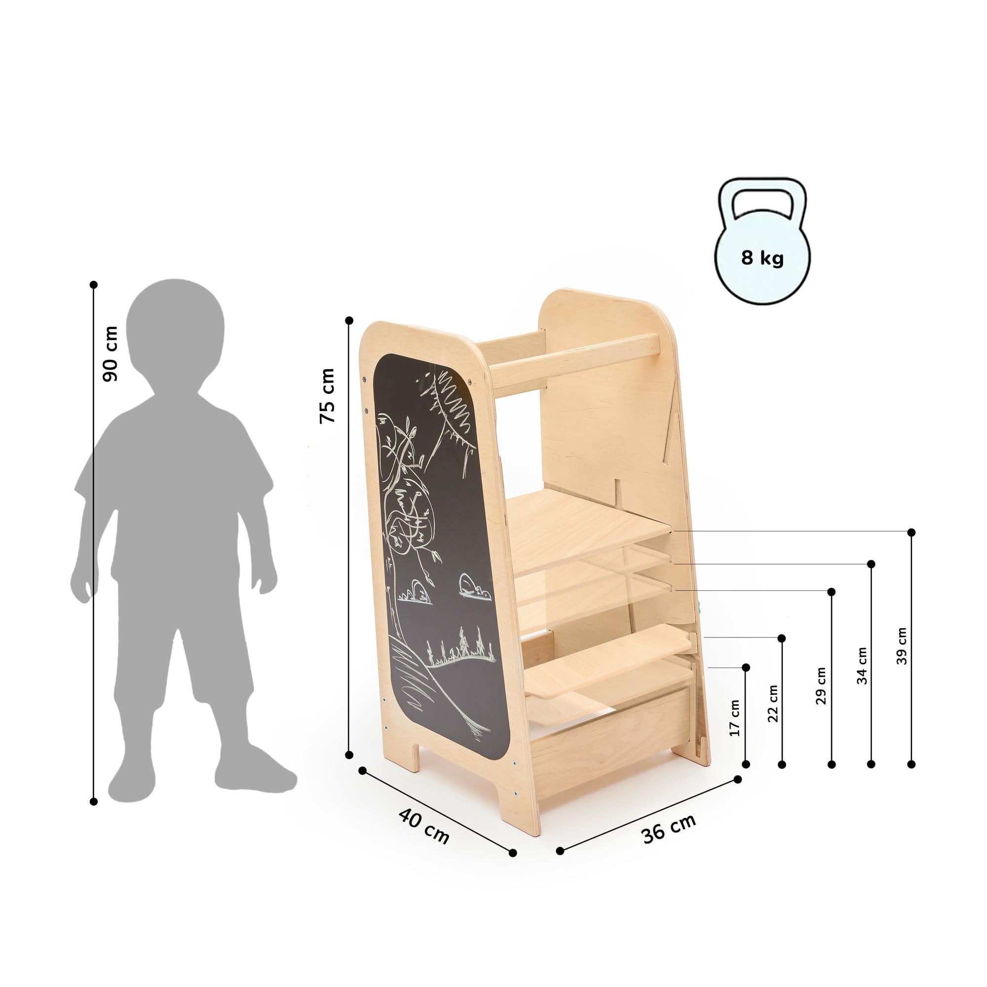 La torre è alta 75 centimetri, ma è progettata adeguarsi alla crescita - l'altezza della piattaforma può essere di tre livelli - per servire il bambino il più a lungo possibile. I lati sono abbastanza alti e sono completati da elementi di gioco, ovvero una pista per biglie, una lavagna nera e ruote - sia dentate che apribili, sotto le quali sono nascoste delle immagini.