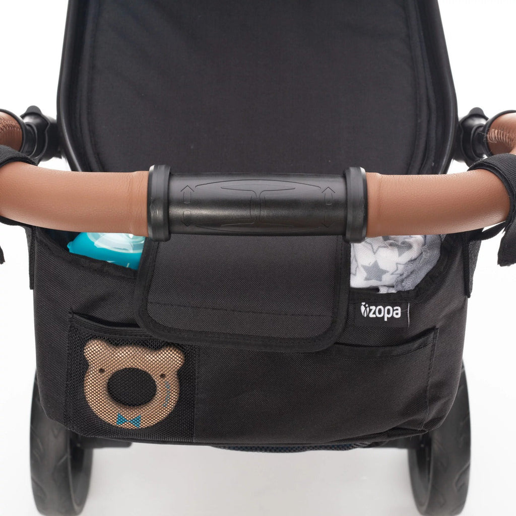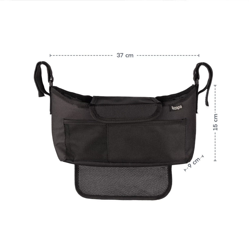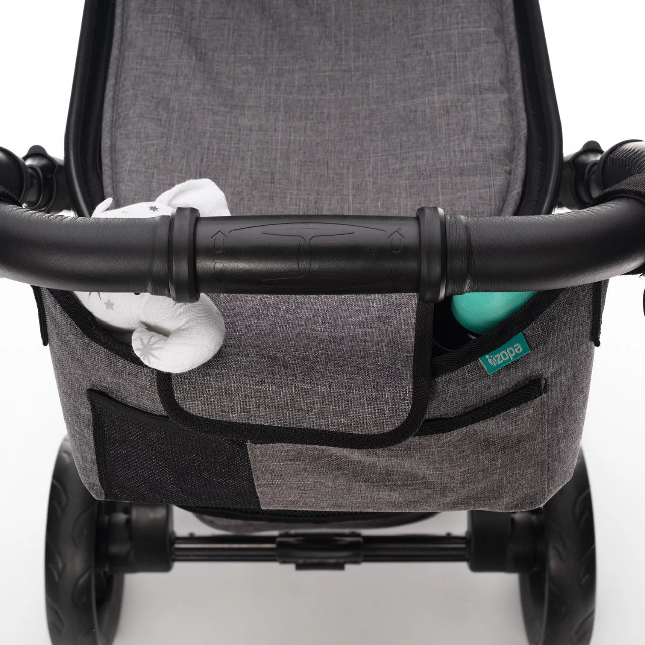 L’organizer offre ampio spazio e sei scomparti per tutti gli oggetti essenziali. La tasca frontale è dotata di un vano in rete per il cellulare e di uno spazio per piccoli oggetti. Sul retro si trova una tasca in rete in cui può essere comodamente riposta una rivista. Lo scomparto principale è progettato in modo da poter posizionare le bottiglie ai lati. L’organizer si fissa facilmente al manico del passeggino grazie a speciali ganci con chiusura a strappo.