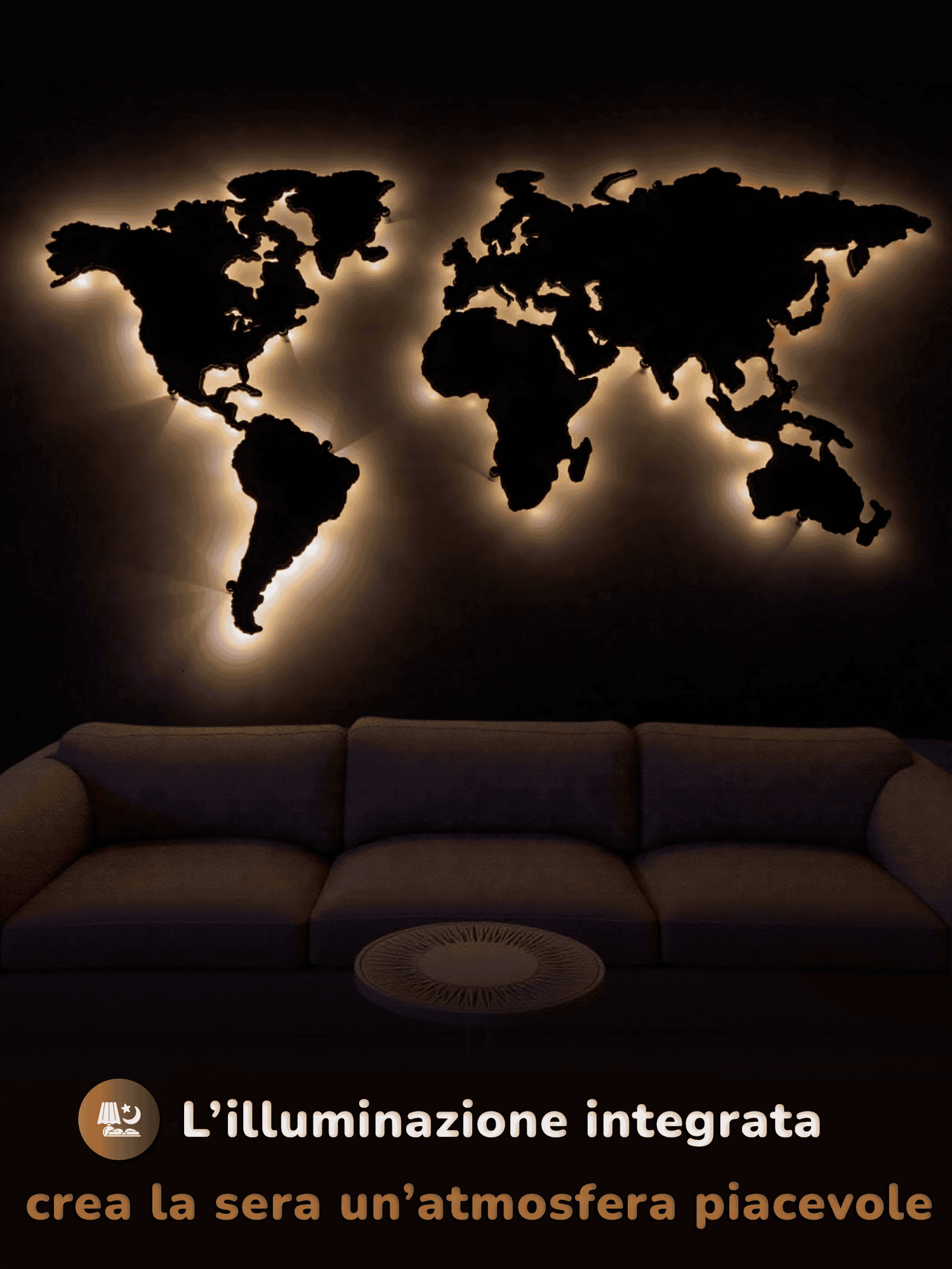 L’illuminazione notturna integrata emette una luce morbida e calda, creando la sera un’atmosfera accogliente e rilassante. In questo modo la mappa diventa non solo uno strumento educativo, ma anche un bellissimo punto decorativo che piace sia ai bambini che ai genitori.