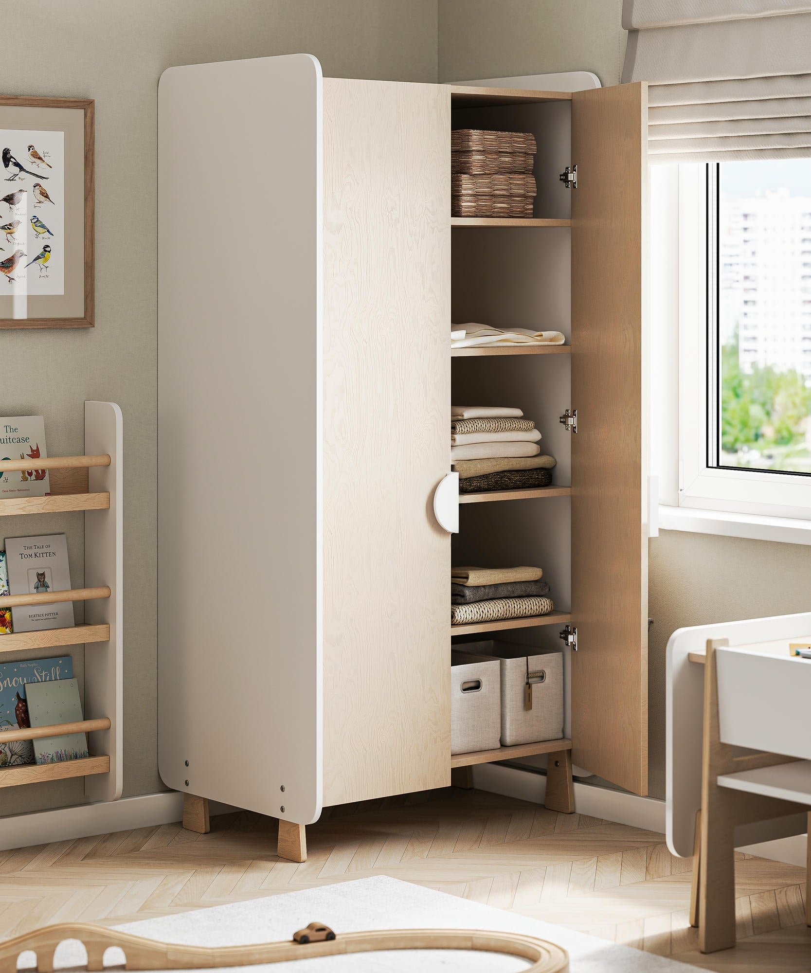 L’armadio MOMO non è solo un luogo dove riporre gli oggetti. È un’occasione per insegnare al bambino l’ordine e la cura per le proprie cose. L’altezza e la disposizione interna sono studiate per permettere al bambino di aprire le ante da solo, piegare i vestiti o prendere gli oggetti dagli scaffali.