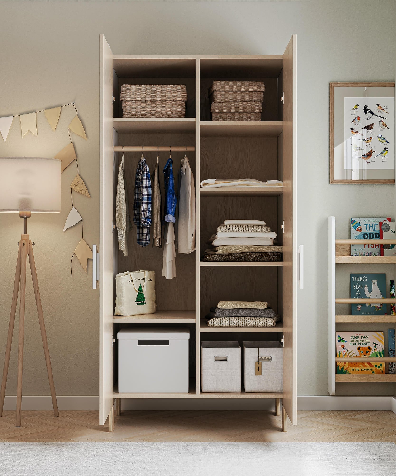 Compatto ma capiente, è perfetto anche per le stanze più piccole. Ideale per abiti, biancheria da letto, scatole di giocattoli o accessori stagionali. Il design neutro lo rende adatto sia alla cameretta che alla camera condivisa con i genitori.