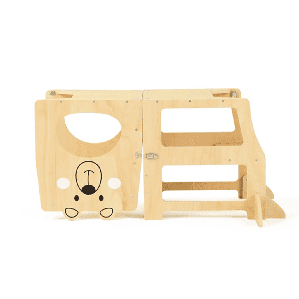 La torre di apprendimento è uno sgabello multifunzionale che permette ai bambini di partecipare a diverse attività creative al piano di lavoro della cucina o alla scrivania. Offre ai più piccoli la possibilità di stare all’altezza del piano di lavoro, vedere tutto ciò che fate e creare insieme a voi, garantendo allo stesso tempo una supervisione costante. La torre è composta da una pedana su cui il bambino si posiziona, un gradino per salire e un corrimano perimetralmente. La superficie nera non è magnetica e serve esclusivamente come lavagna per scrivere con il gesso.