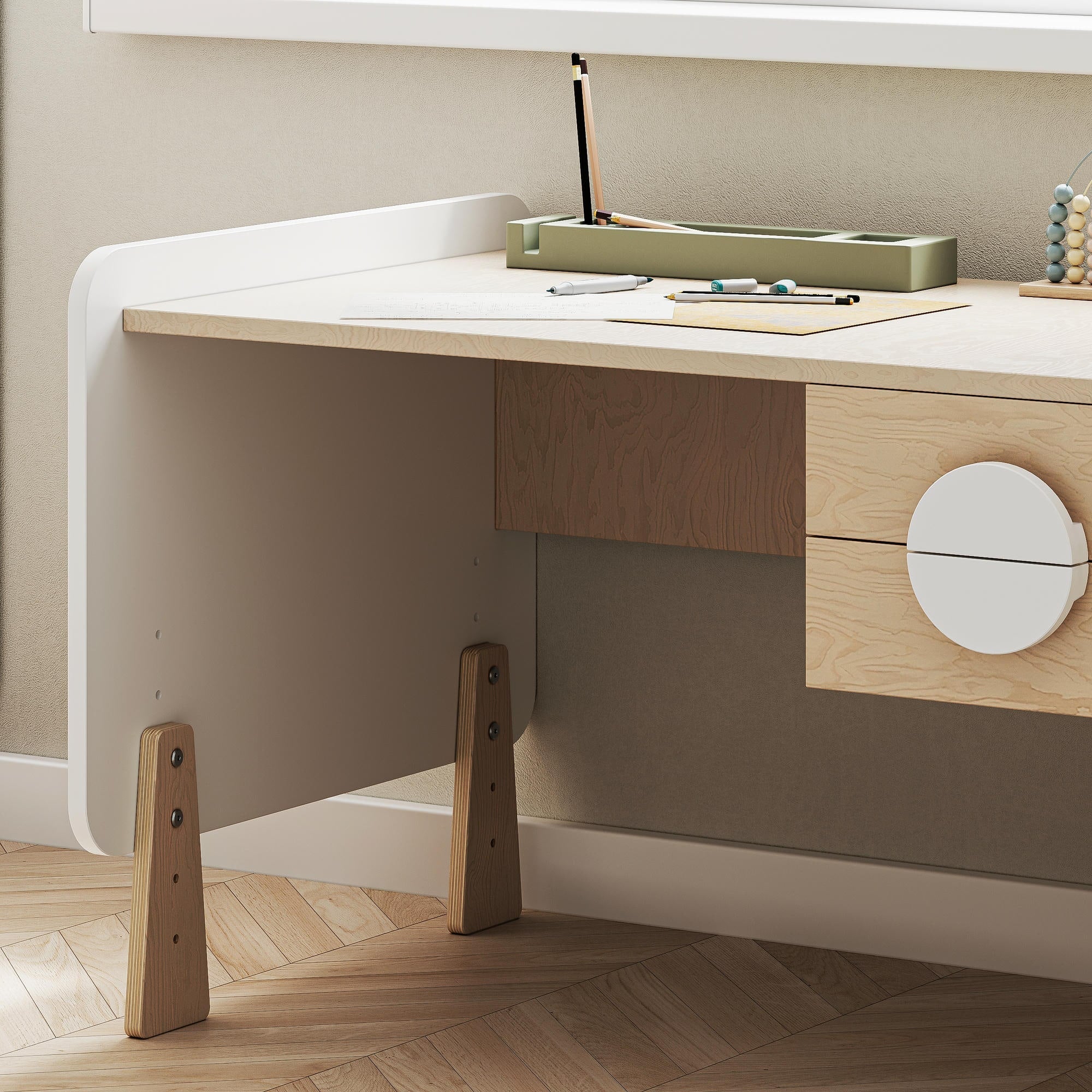 Il tavolo è progettato pensando all’ergonomia infantile — posizione comoda, postura corretta e un piano spazioso per ogni tipo di attività. Il design è leggero, arioso, in perfetto stile scandinavo. La struttura, invece, è solida, affidabile e pensata per durare nel tempo.