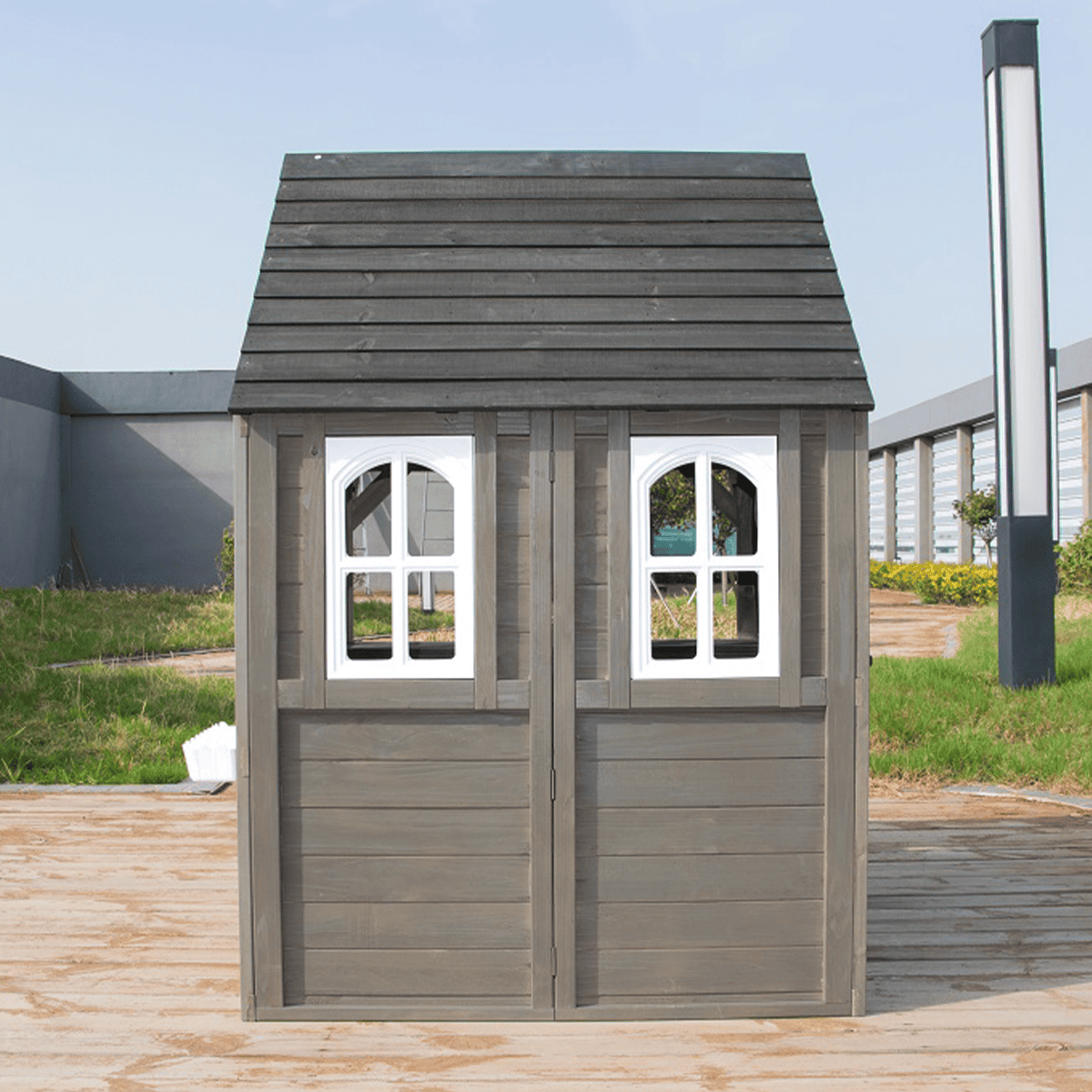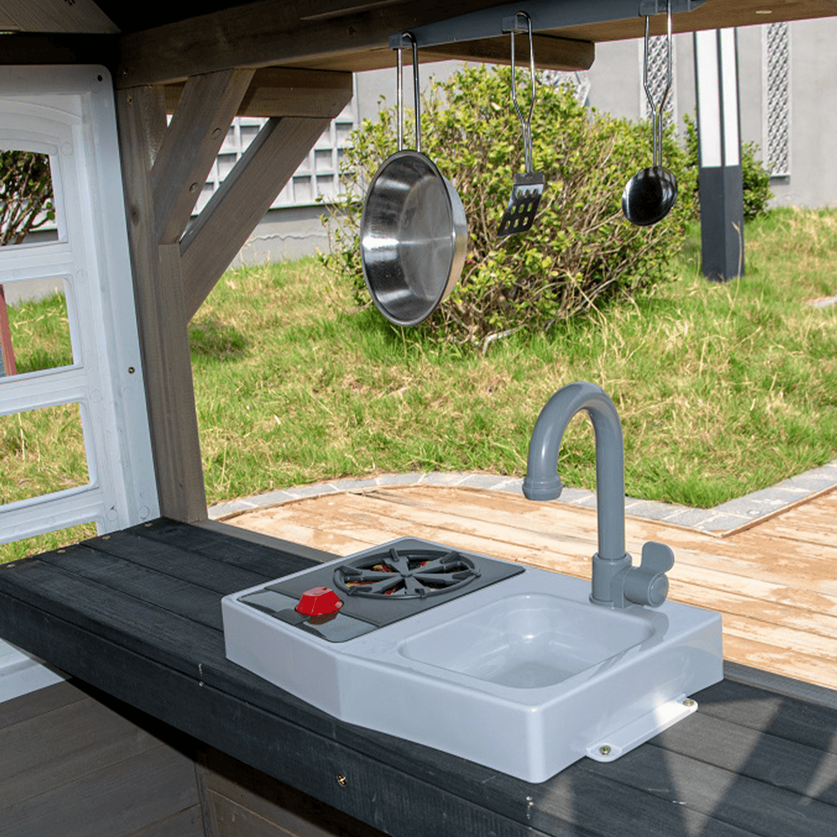 Nella confortevole cucina giocattolo si trovano un piano cottura con manopola rossa girevole, un lavello e utensili di base, così i piccoli chef possono mettere alla prova le proprie abilità culinarie e preparare menu per amici o genitori. Tra gli altri accessori troviamo un orologio, fioriere ai lati della porta d’ingresso e un pratico ingresso per il cane, coperto da una tenda in tessuto a tema cuccia. La casetta è realizzata in legno e verniciata con colori naturali, rendendola un elegante elemento decorativo per ogni giardino o piccolo spazio esterno.