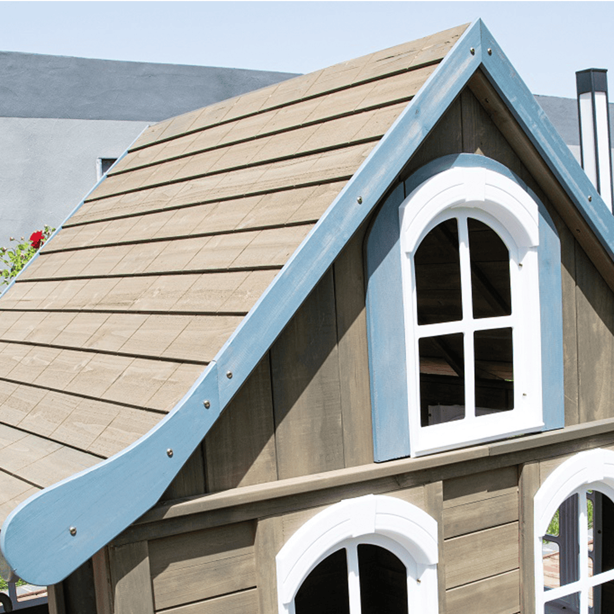La casetta è dotata di un orologio, lavagne per il gesso e fioriere. La cucina giocattolo accogliente, con lavello, piano cottura e banco di servizio, permette ai piccoli chef di mettere in pratica le proprie abilità culinarie. Una panca invita a condividere le delizie con gli amici. Il campanello funzionante rende il gioco ancora più realistico.