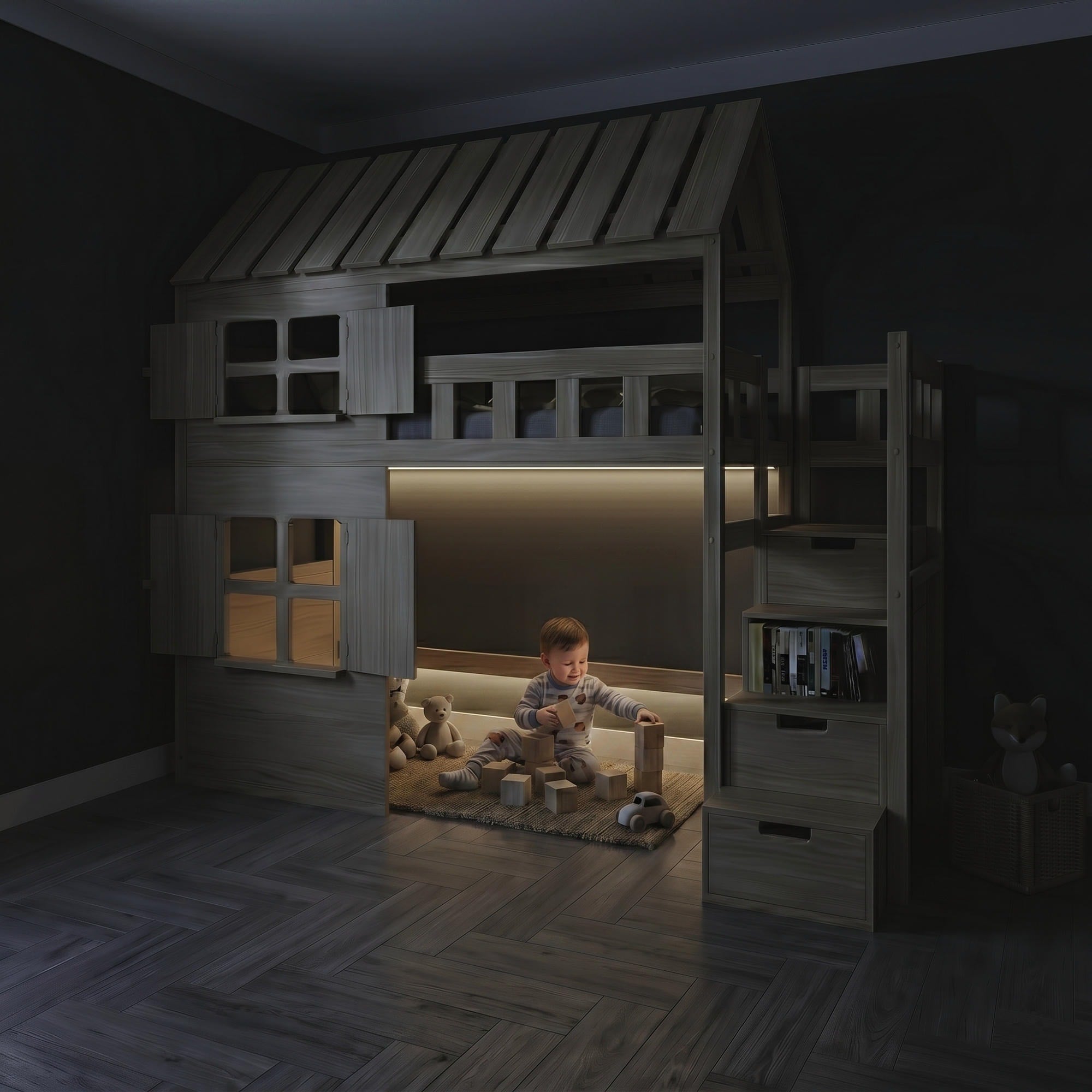 Nella parte superiore si trova la zona notte con un grande tetto, che rende la struttura ancora più accogliente ed espressiva. Il tetto rafforza la sensazione di uno spazio protetto e trasforma il letto in una piccola casa in cui il bambino si addormenta volentieri, si riposa e si sente al sicuro.