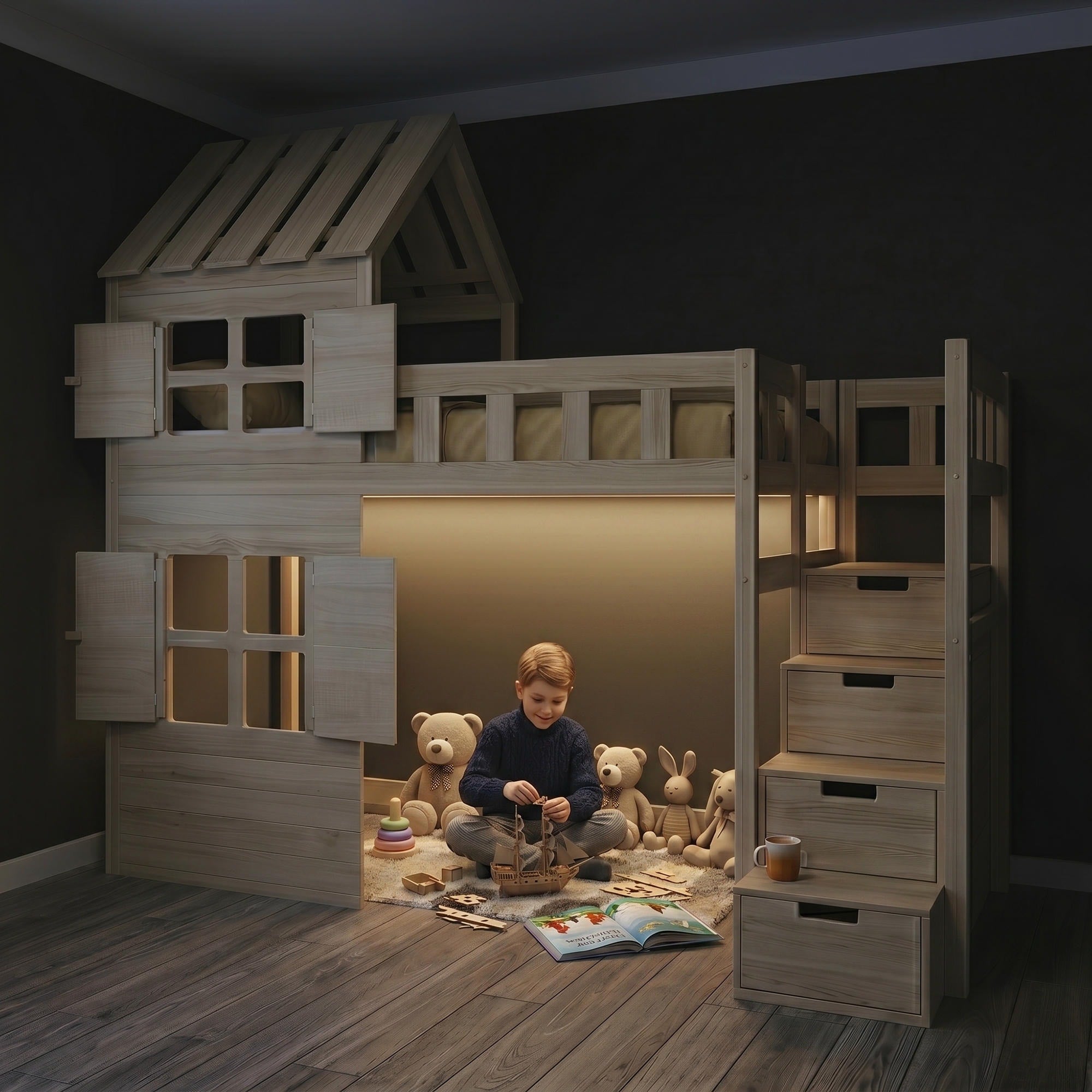BusyKids Letto a soppalco GALAXY-HOUSE con mezzo tetto e scala contenitore 90 x 200 cm è un elegante e funzionale letto a soppalco per bambini che unisce un comodo posto per dormire, un accogliente spazio personale e un’area dedicata al gioco. Grazie al design a forma di casetta con un decorativo mezzo tetto, il letto crea per il bambino un’atmosfera speciale di comfort, protezione e tranquillità.