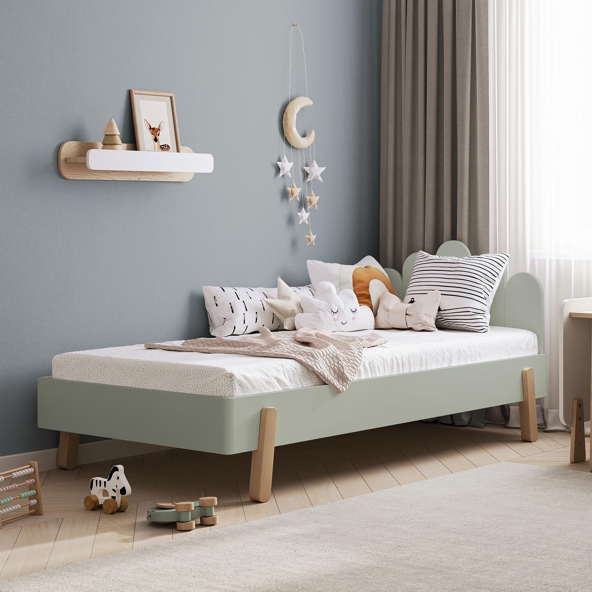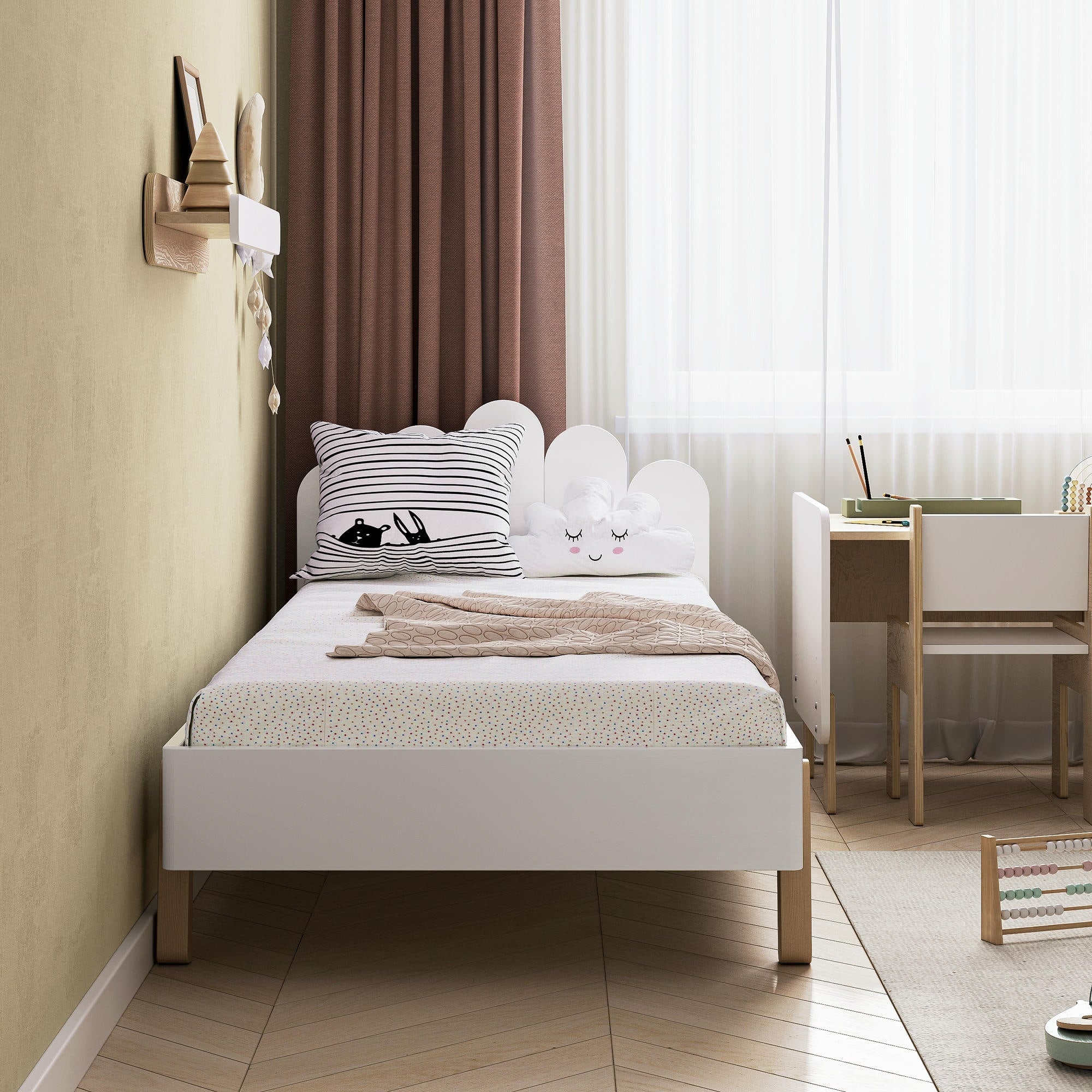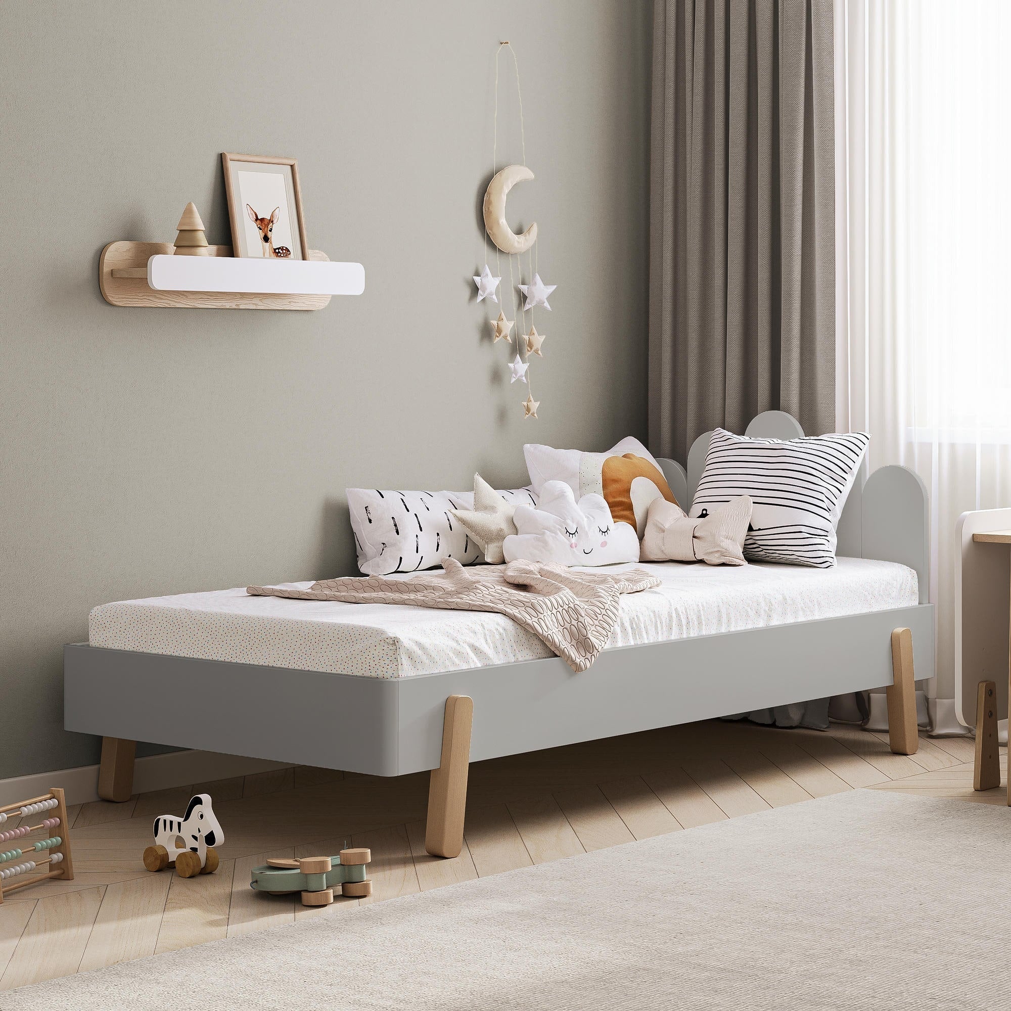 Il letto è dotato di una sponda di sicurezza continua che garantisce maggiore protezione durante il sonno. La struttura è realizzata in legno massello di abete, con una finitura ecologica a base d’acqua. Gli angoli arrotondati e le superfici levigate assicurano un utilizzo sicuro per i bambini. La solida costruzione supporta fino a 120 kg, consentendo anche ai genitori di sedersi accanto al bambino per la lettura serale.