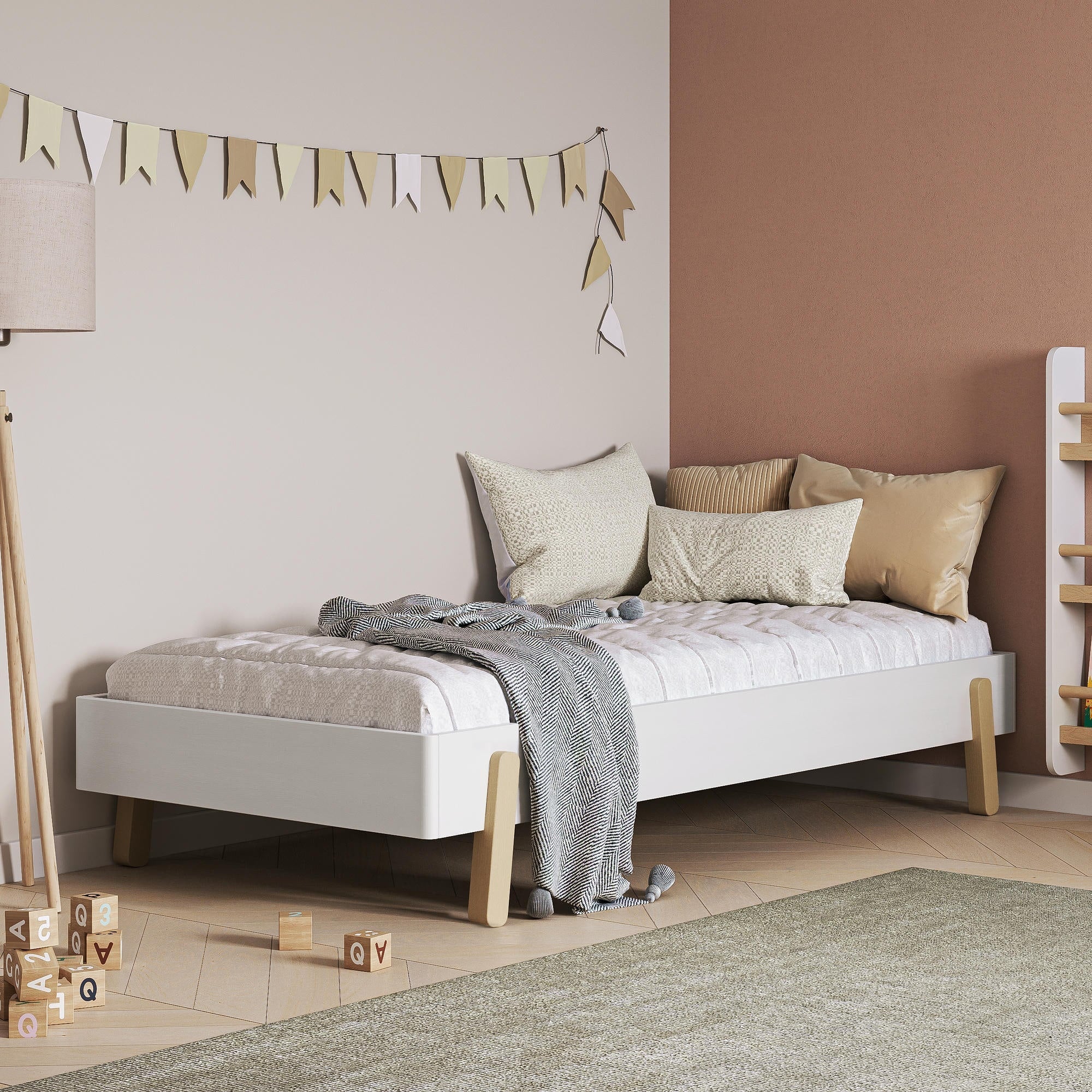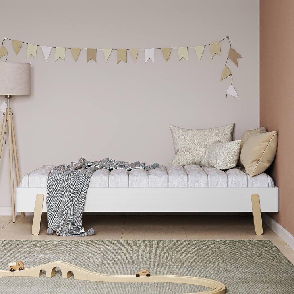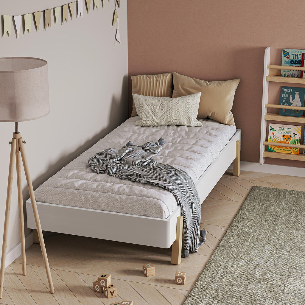 Realizzato in legno massello di abete con una finitura ecologica, unisce minimalismo e solidità. È dotato di una sponda laterale di sicurezza, ideale per i bambini che passano dal lettino al letto più grande. La struttura è progettata per sostenere fino a 120 kg, consentendo anche ai genitori di sedersi comodamente accanto al bambino durante la lettura. Raccomandato per bambini a partire dai 3 anni. Disponibile in diverse varianti di colore e con scelta tra gambe dritte o inclinate. Il montaggio è semplice grazie alle istruzioni dettagliate incluse.