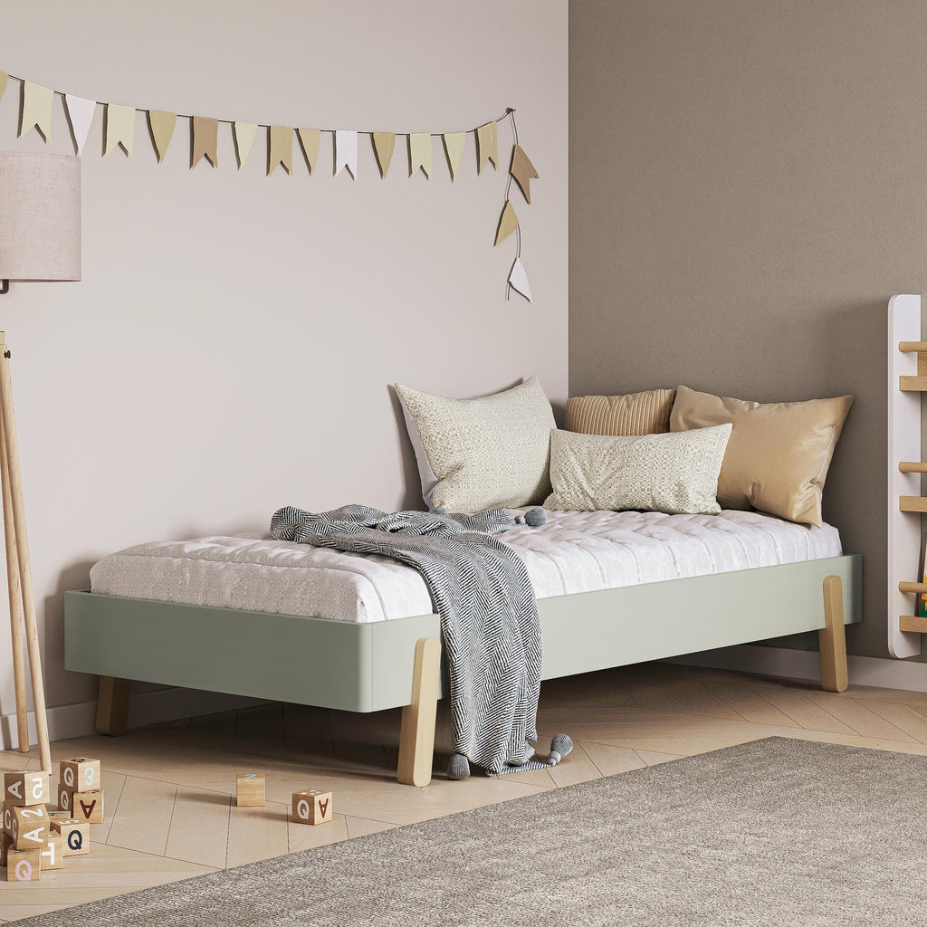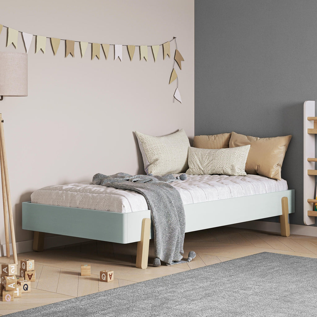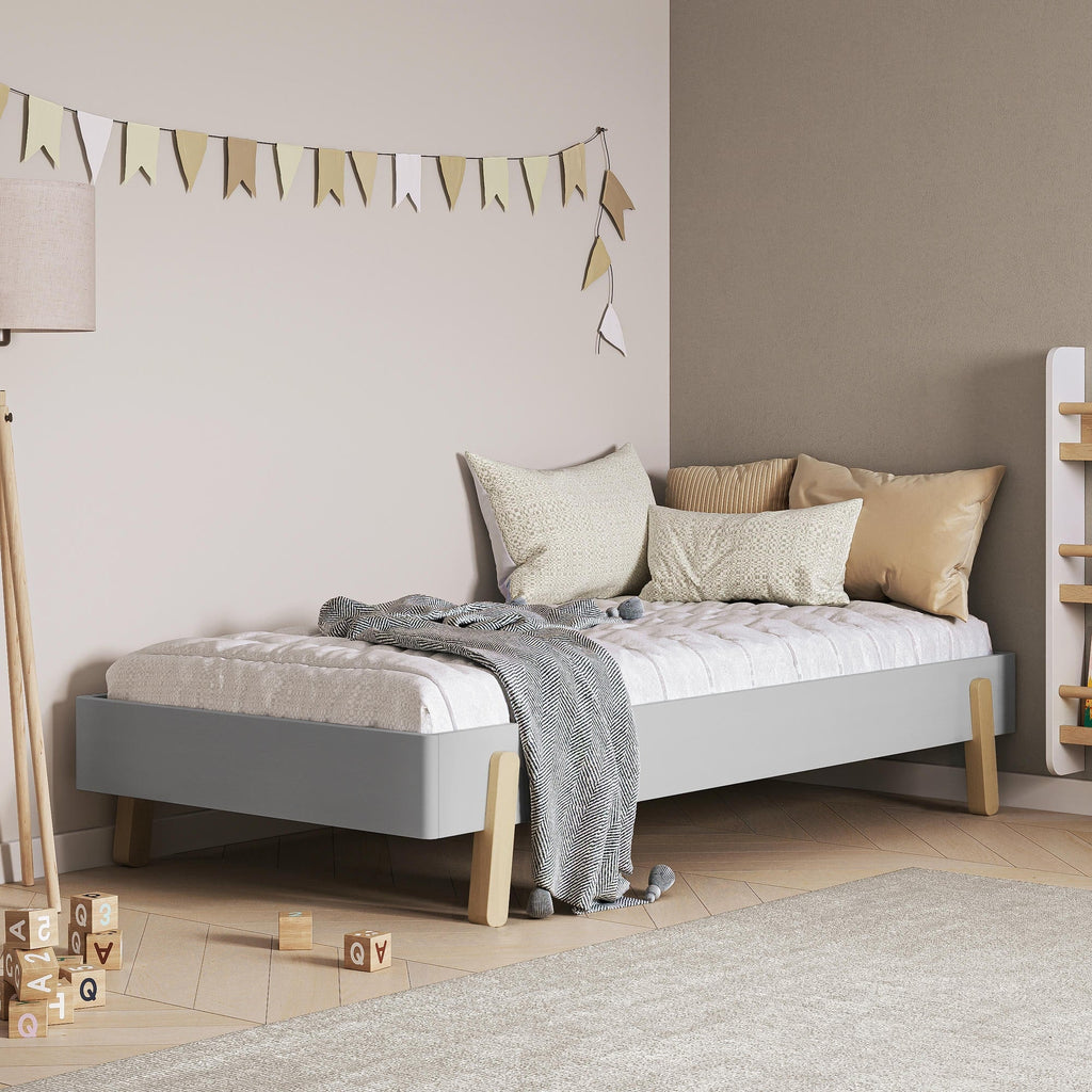 Realizzato in legno massello di abete con una finitura ecologica, unisce minimalismo e solidità. È dotato di una sponda laterale di sicurezza, ideale per i bambini che passano dal lettino al letto più grande. La struttura è progettata per sostenere fino a 120 kg, consentendo anche ai genitori di sedersi comodamente accanto al bambino durante la lettura. Raccomandato per bambini a partire dai 3 anni. Disponibile in diverse varianti di colore e con scelta tra gambe dritte o inclinate. Il montaggio è semplice grazie alle istruzioni dettagliate incluse.