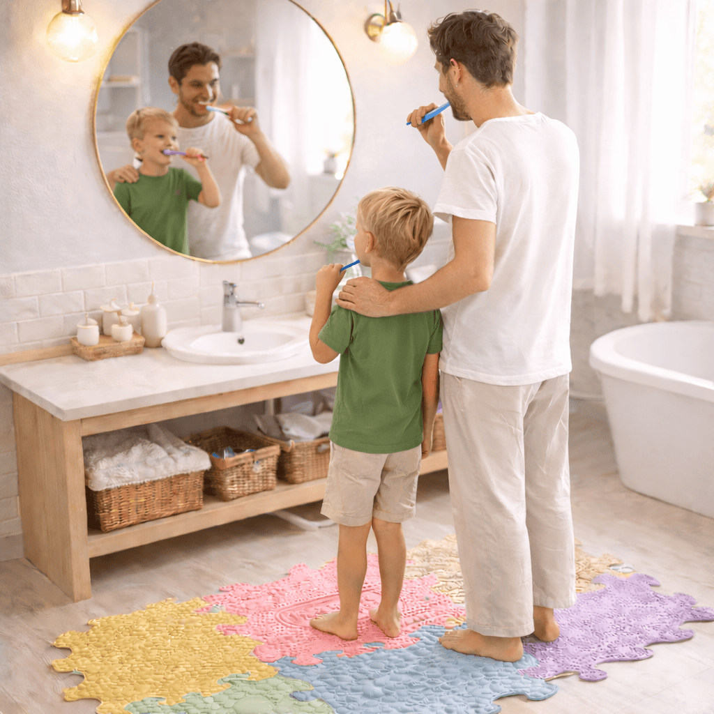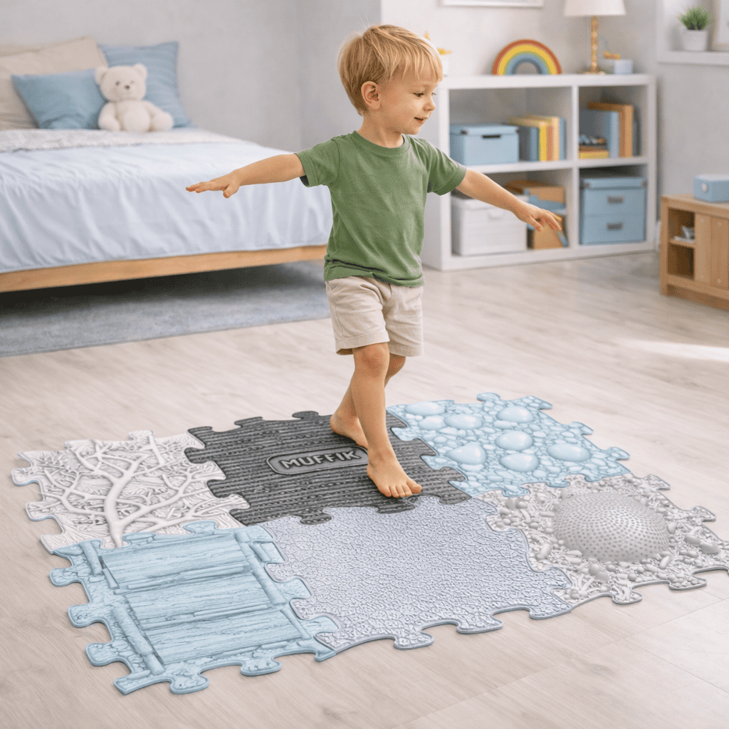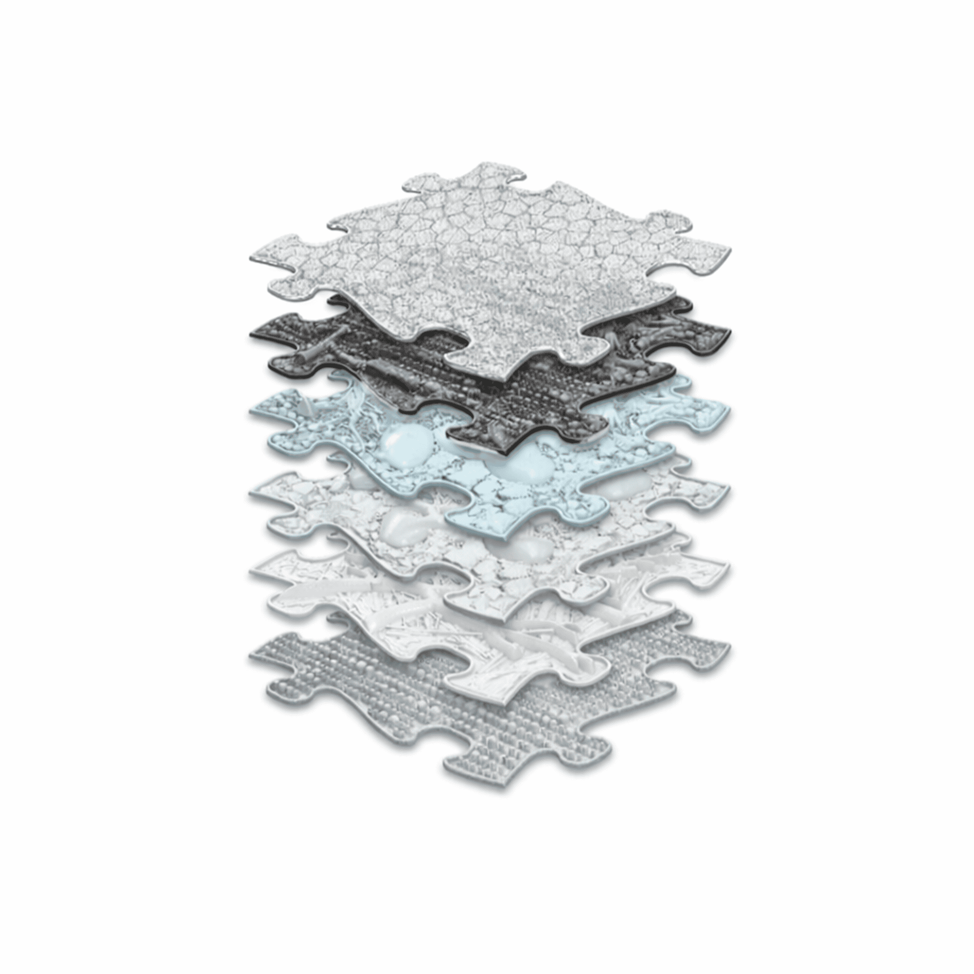 Il set di tappetini ortopedici BusyKids con elementi modulari 3D è stato progettato per unire movimento, gioco e attività salutare. Le diverse superfici strutturate si ispirano a forme naturali come ciottoli, rami o terreni irregolari del bosco. In questo modo le piante dei piedi vengono stimolate e ogni movimento sul tappetino si trasforma in un piccolo allenamento divertente.
