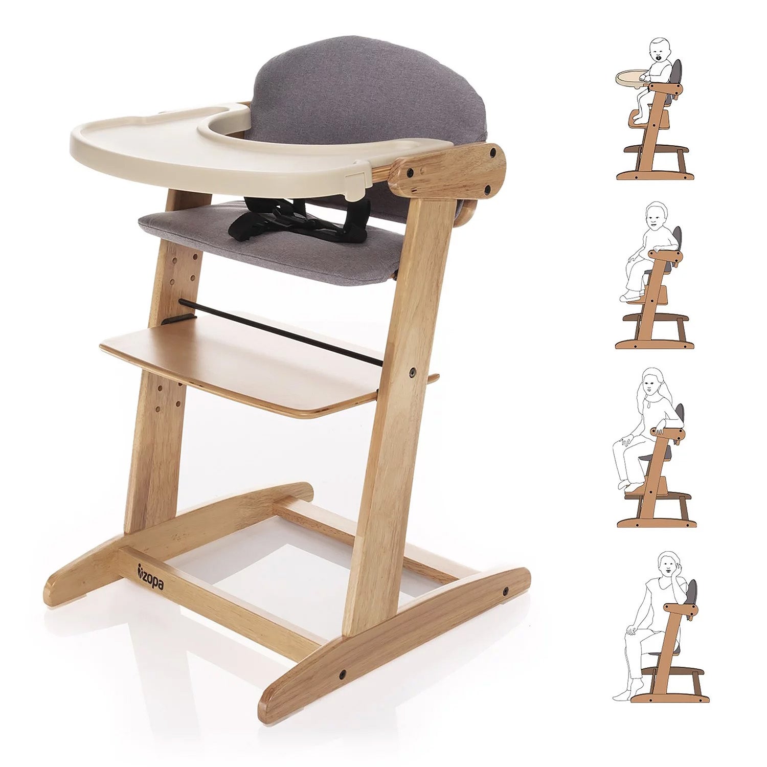 Con sedile regolabile in altezza e profondità, poggiapiedi regolabile, pratico vassoio con inserto, cinture di sicurezza, morbida imbottitura, portata fino a 60 kg e legno di alta qualità – questo è il seggiolone Grow-up.