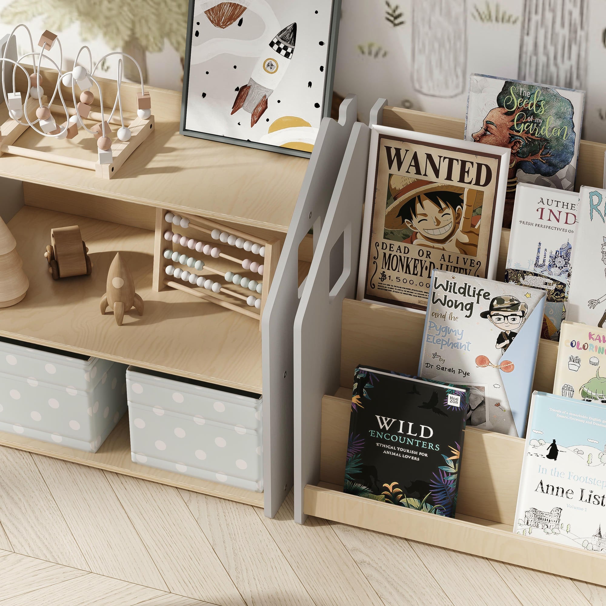 Questo set di scaffali per gioccatoli e libri è perfettamente progettato per i bambini affamati di conoscenza. Grazie al suo design minimalista, il set si adatta a quasi tutti gli interni. Completa la stanza del bambino con questi bellissimi mobile.
