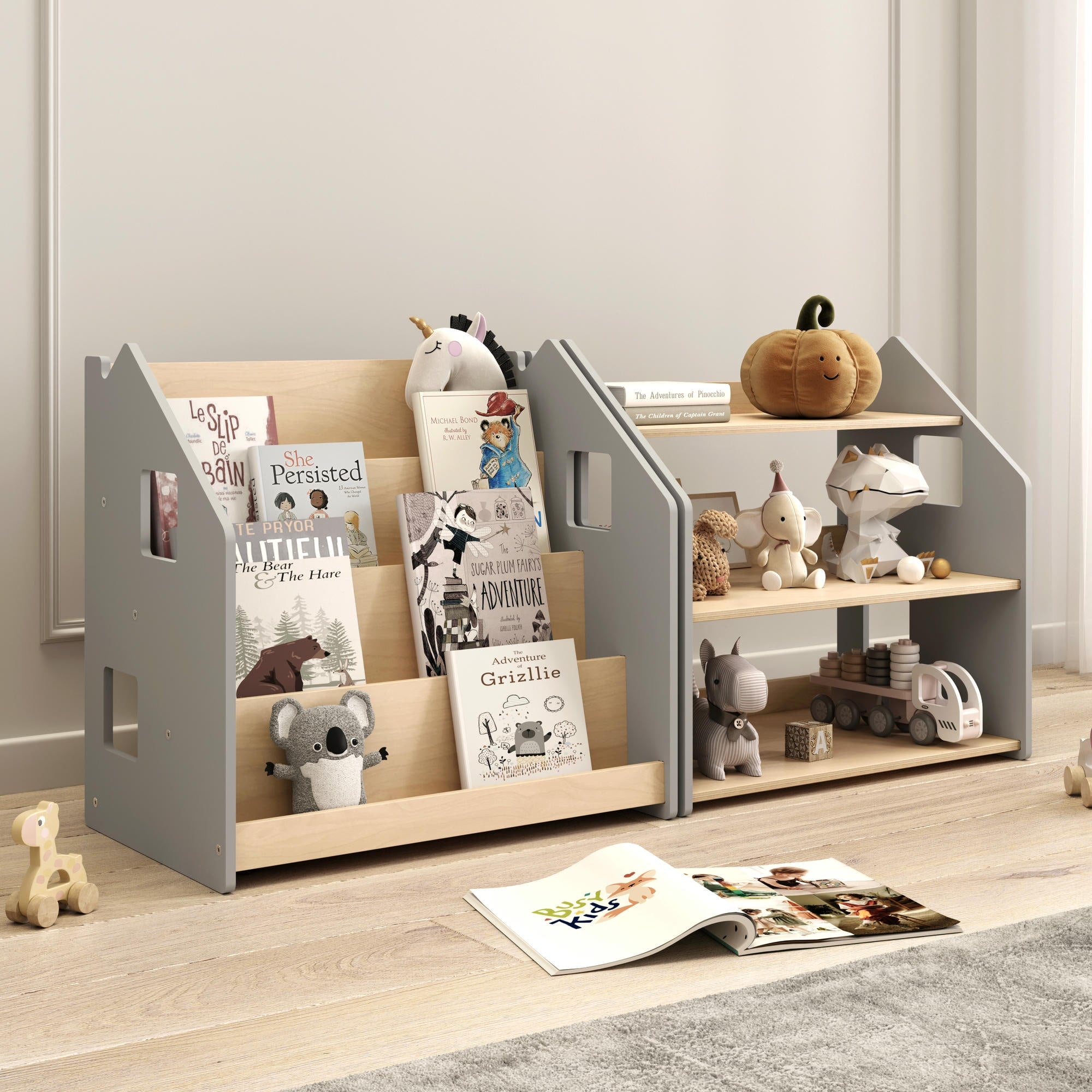 Libreria montessoriana + Scaffale portagiochi Set - Bianco e Grigio