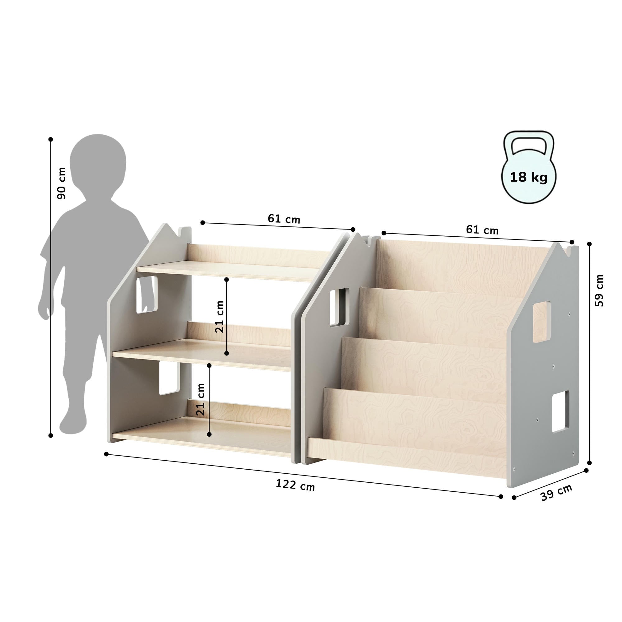 Lo scaffale è di dimensioni pratiche per essere utilizzato da un bambino senza l'aiuto di un adulto: sistemare i giocattoli, tirarli fuori, giocare e rimetterli a posto. I giocattoli saranno a portata di mano del bambino e lo spazio nella sua stanza sarà organizzato efficacemente.